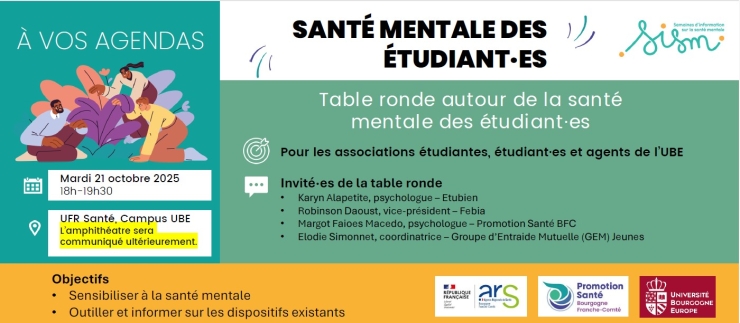 L’association étudiante, la FEBIA, et Promotion Santé BFC, ont le plaisir d’organiser une Table ronde de la santé mentale des étudiant·es au sein de l’UFR Santé