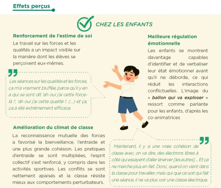 Les effets observés auprès des élèves et des professionnels confirment l’intérêt de poursuivre le renforcement des compétences psychosociales dans la classe et, plus largement, au sein de l’école.