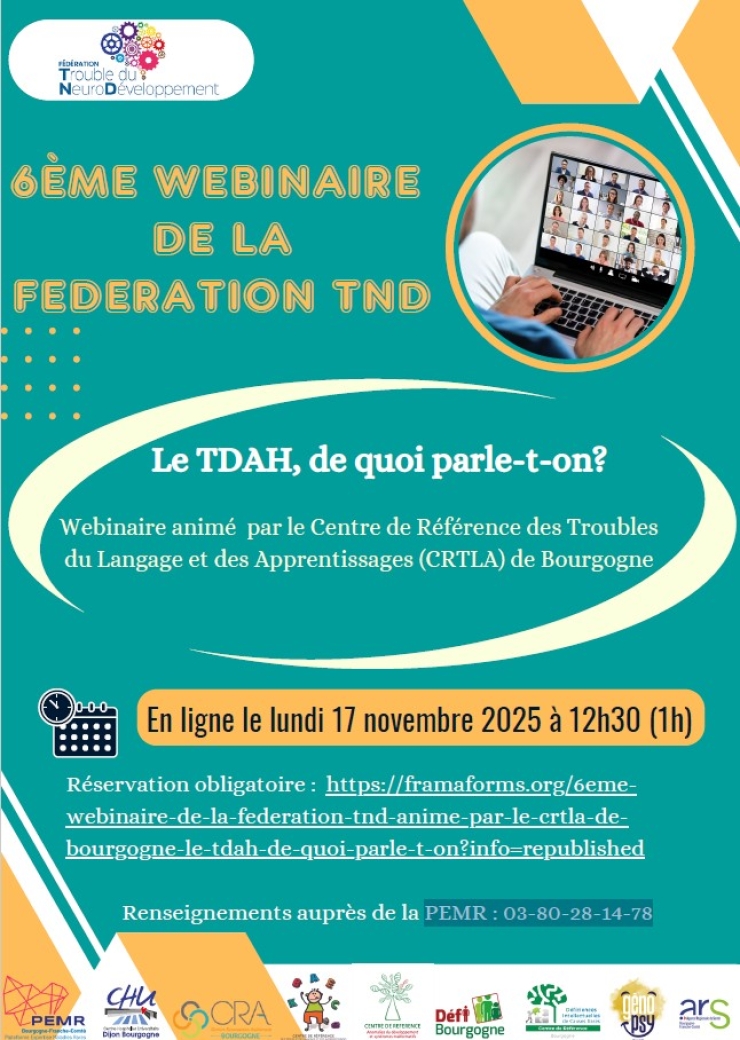 Avec le soutien de la Plateforme Expertise Maladies Rares (PEMR), la Fédération des TND au sein du CHU Dijon Bourgogne organise son 6e webinaire sur le TDAH.
